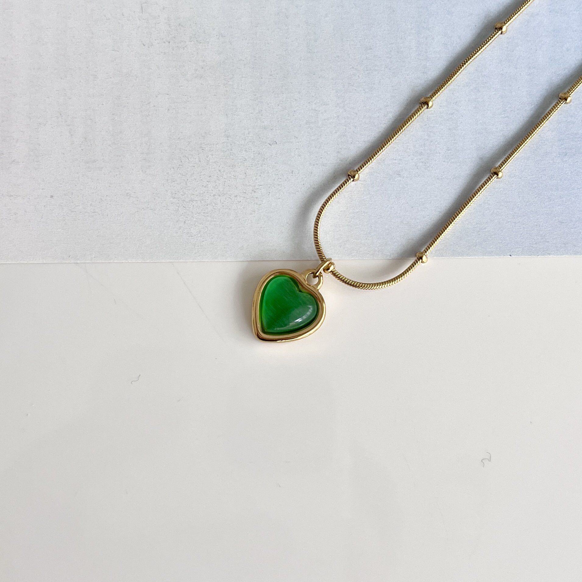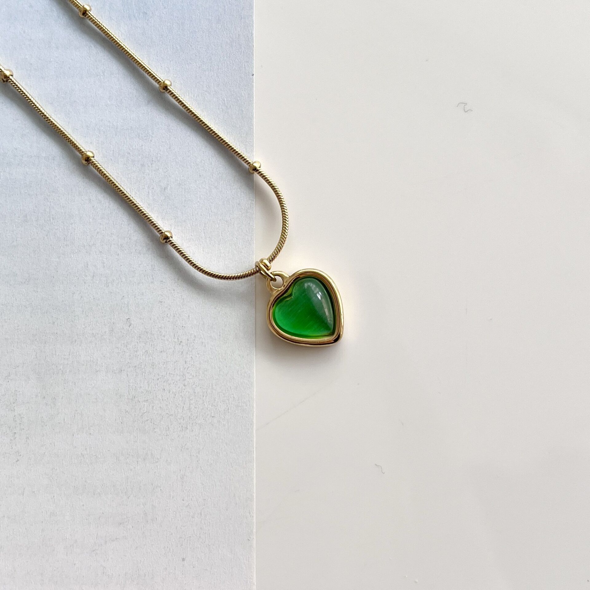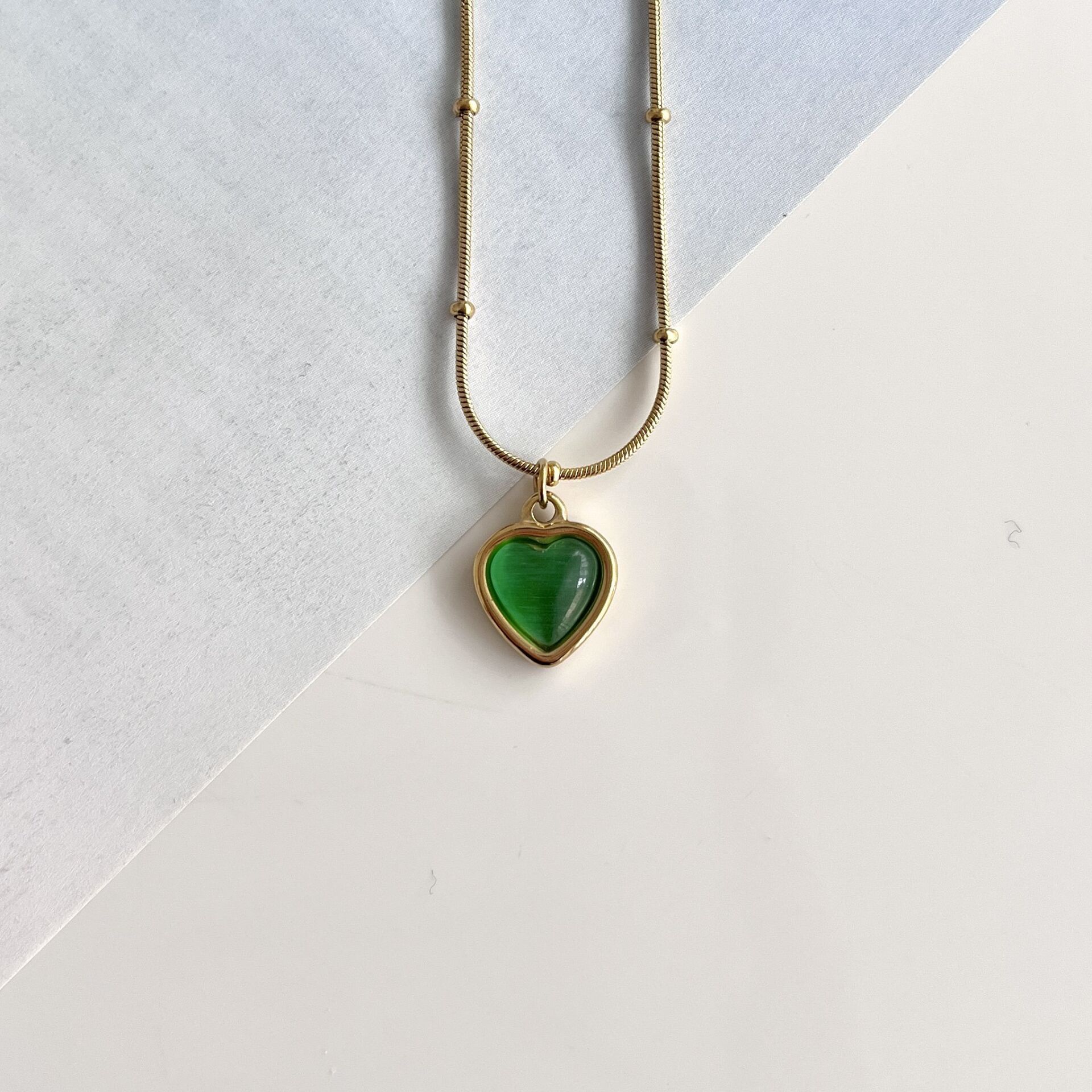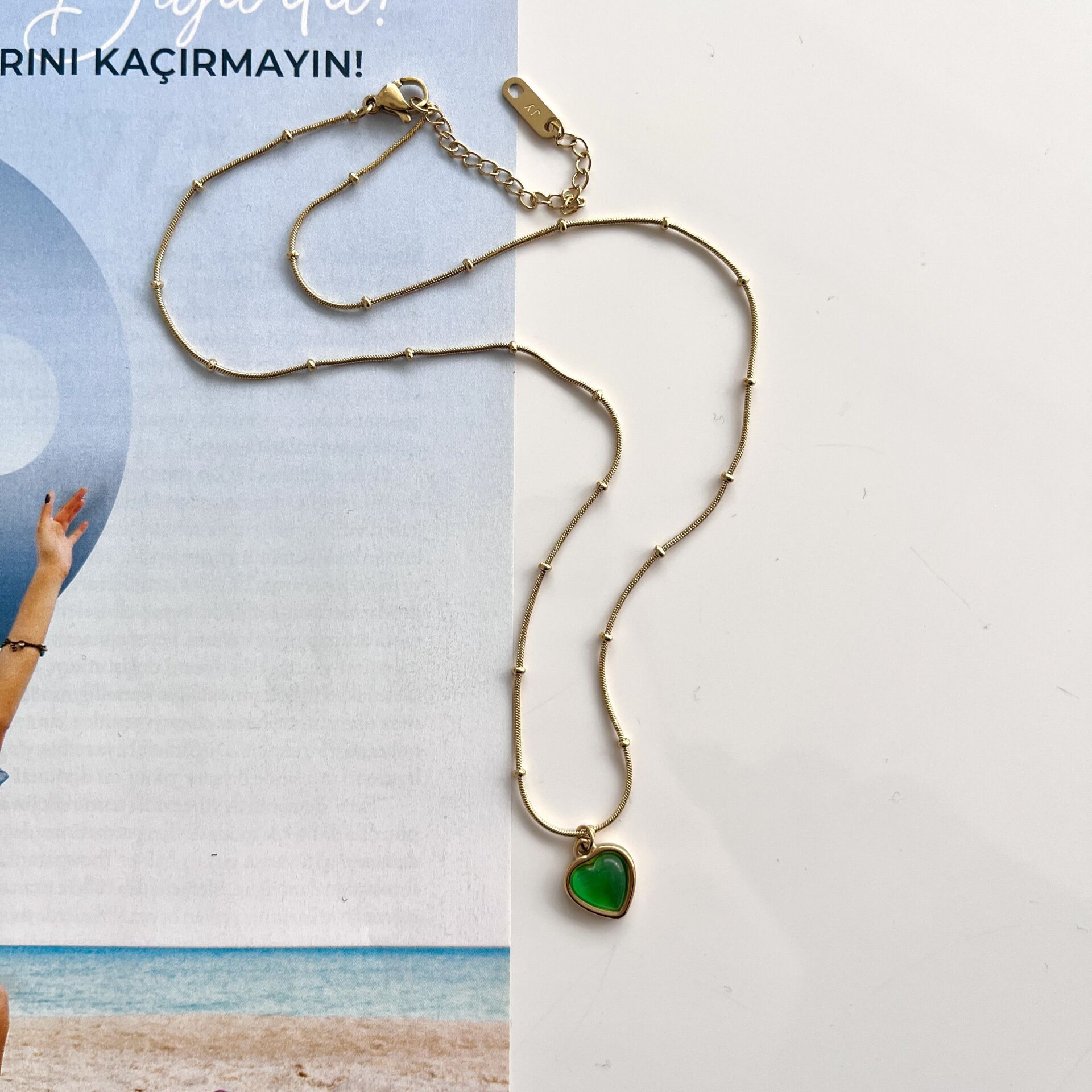 Çelik Kedi Gözü Yeşil Kalp Kolye