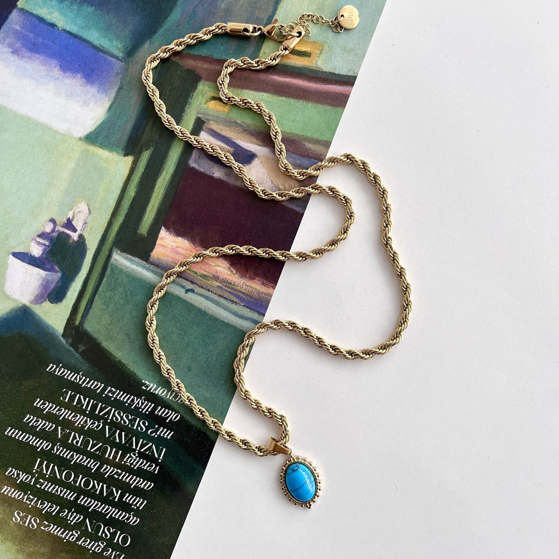 Çelik Turkuaz Taşı Kolye (Uzun Boy)