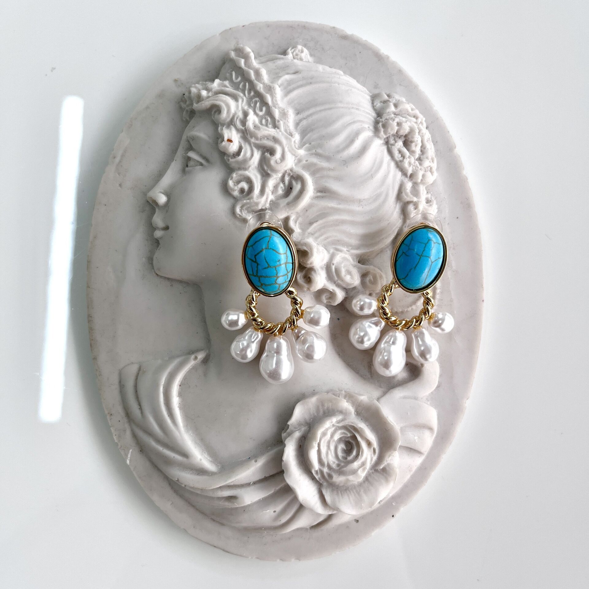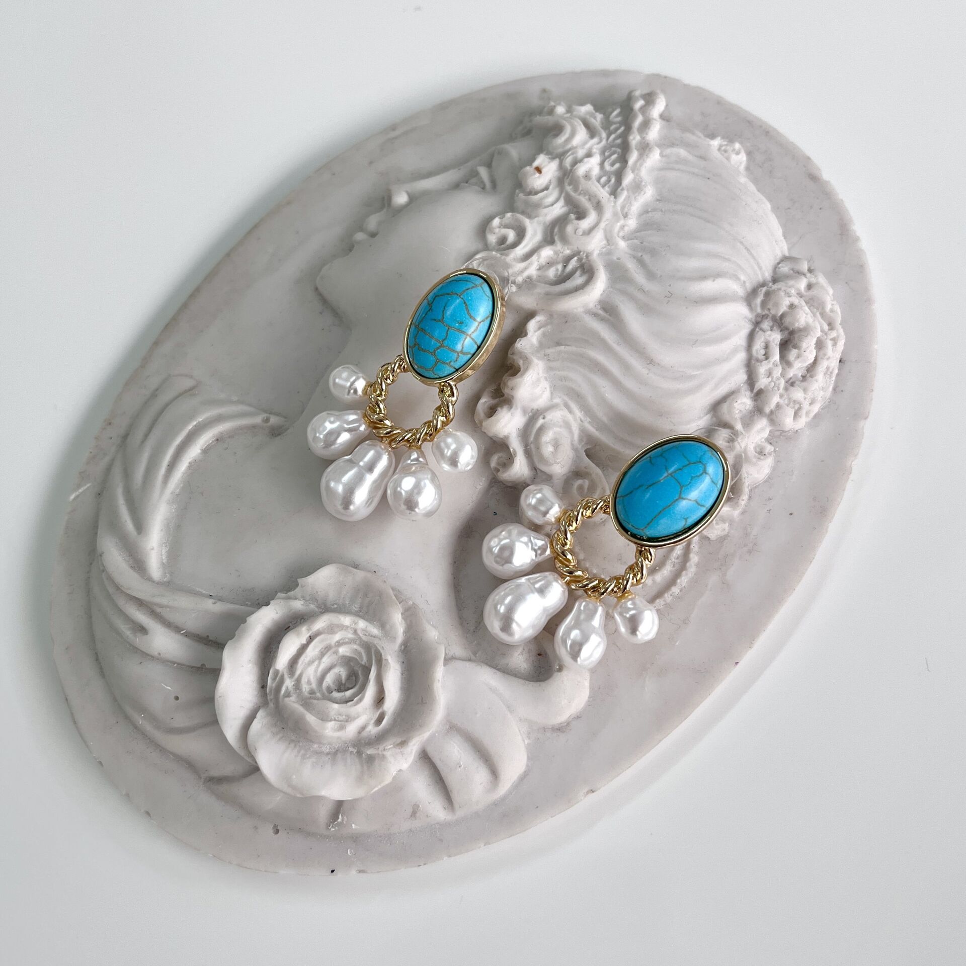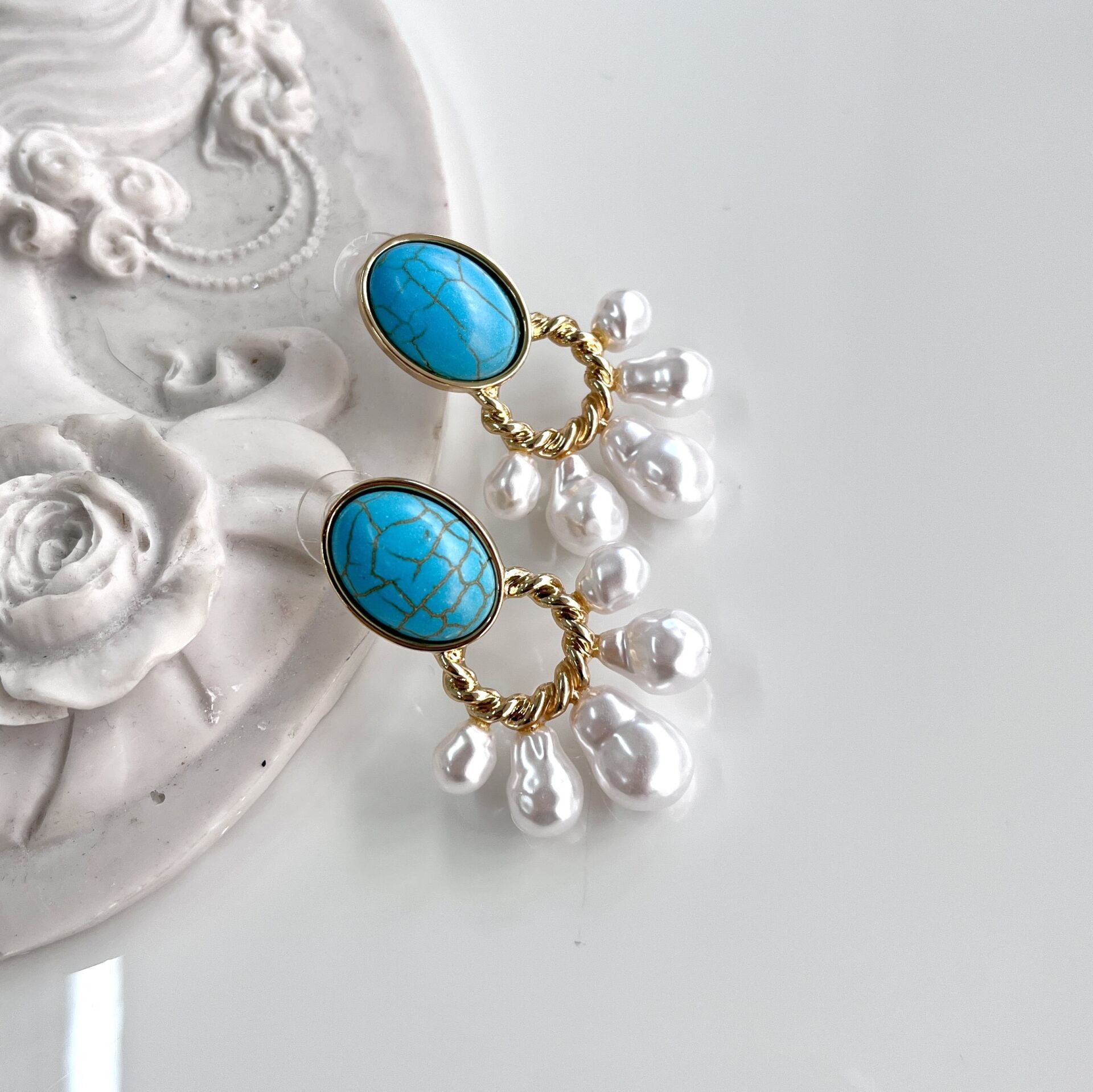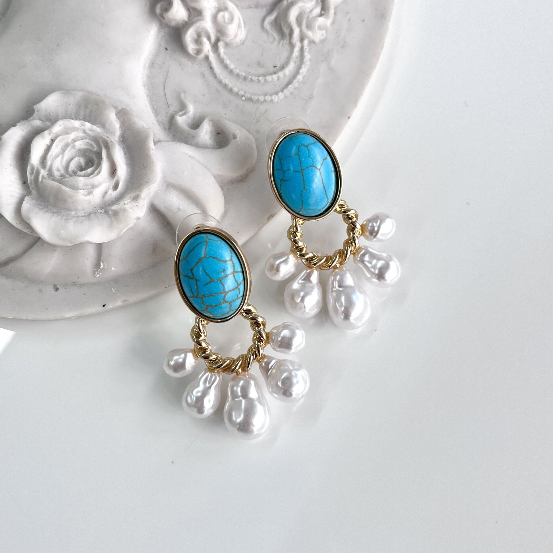 Doğal Turkuaz taşlı, pirinç kaplama küpe.