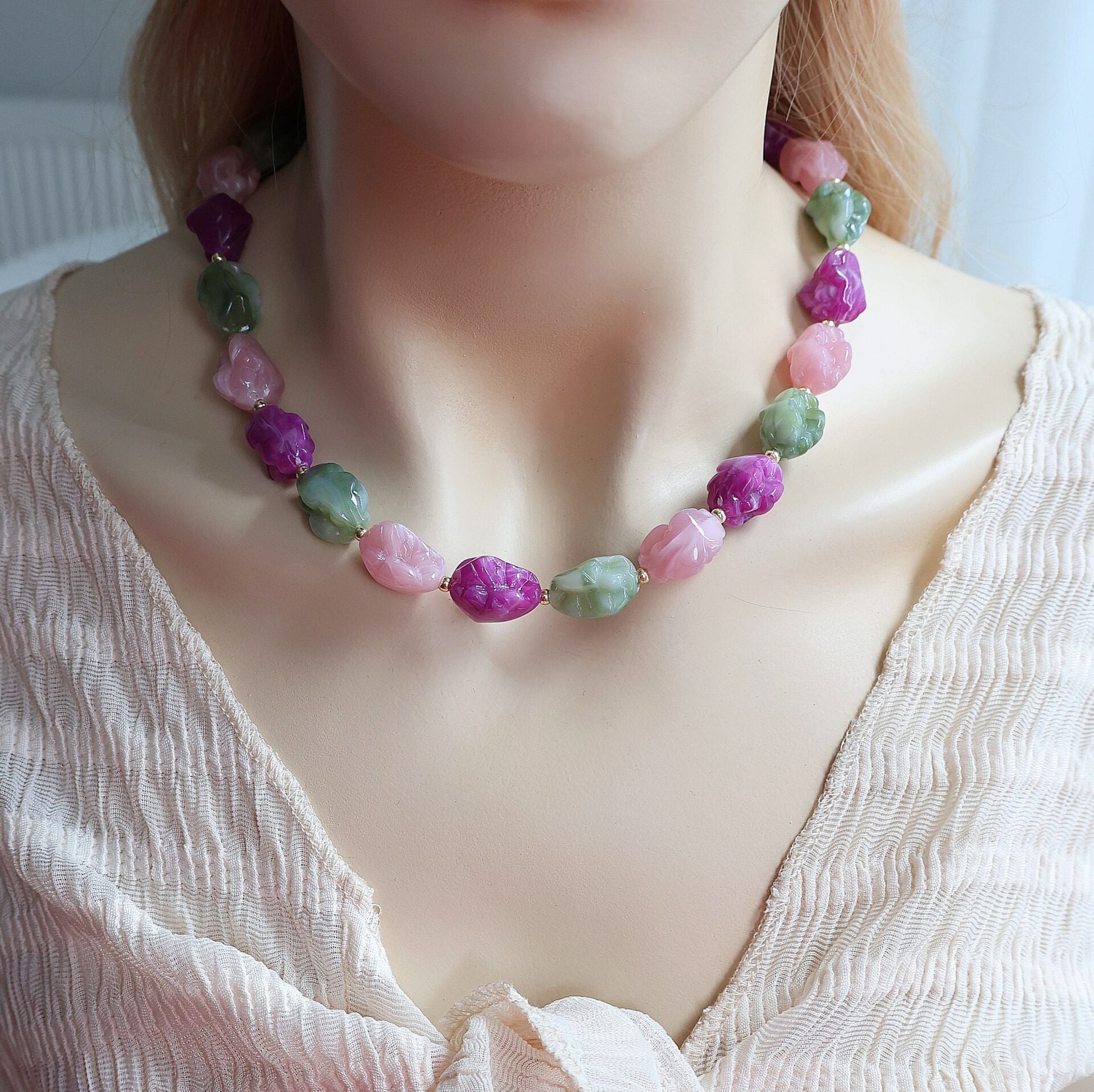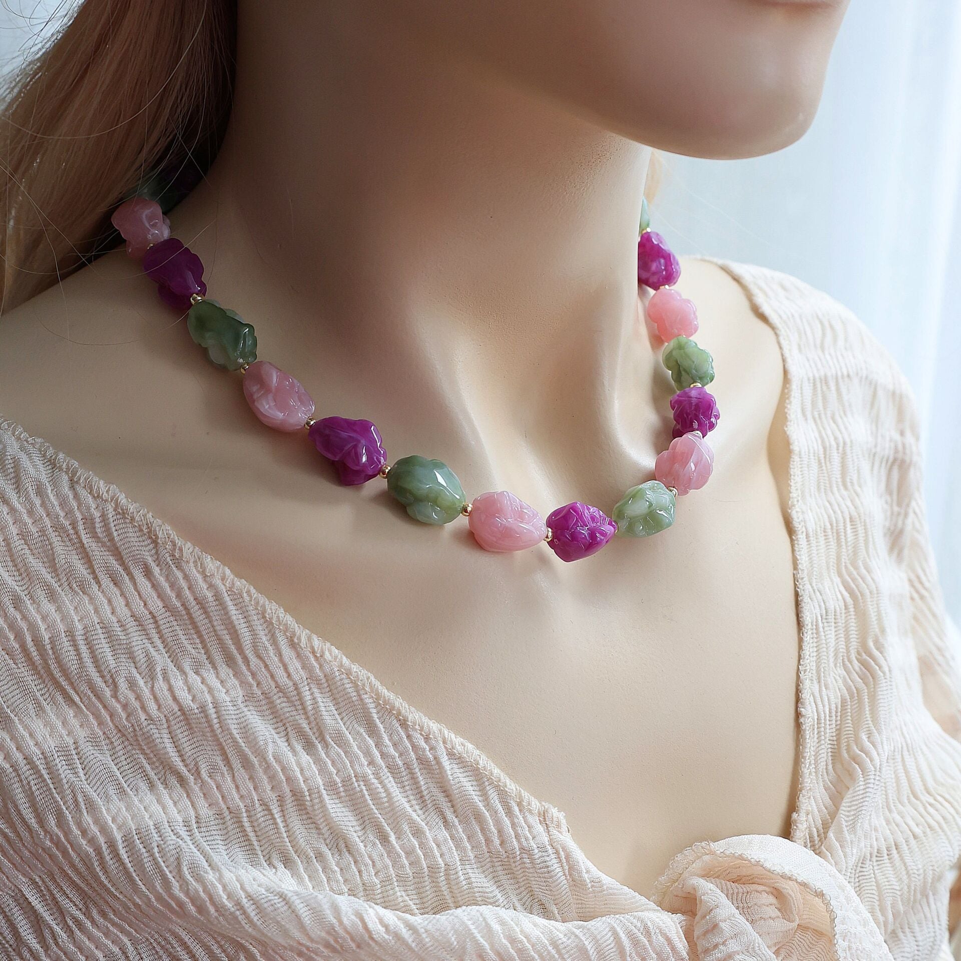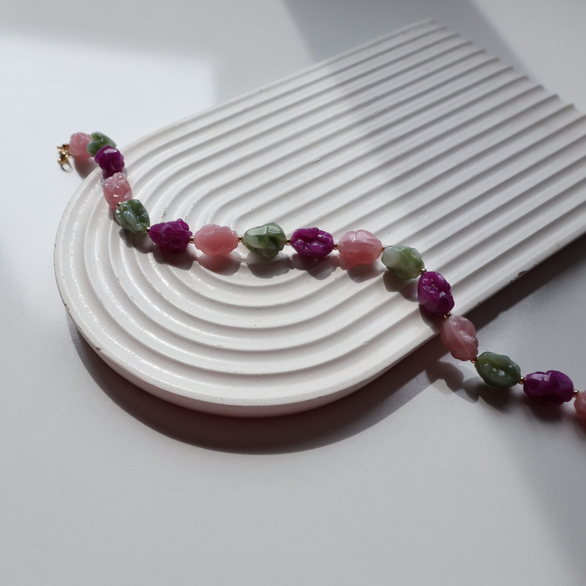 Akrilik boncuk ve pirinç malzemeden imal edilmiştir.