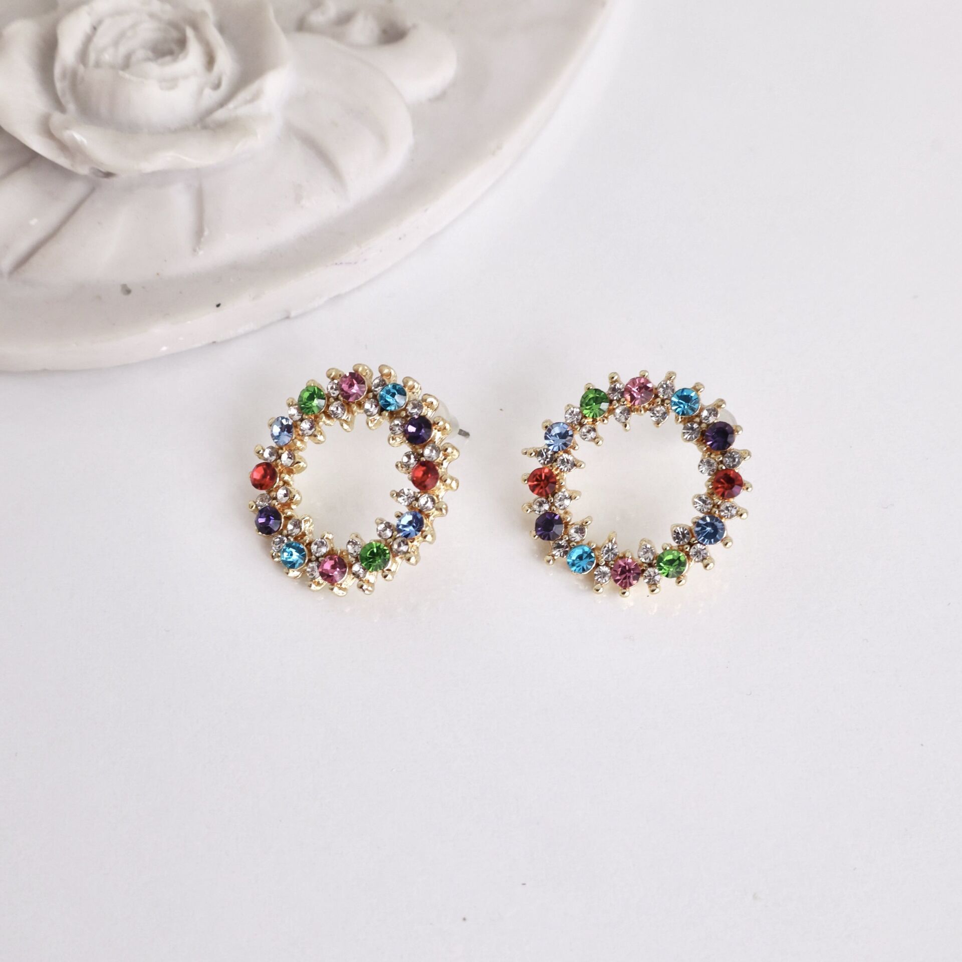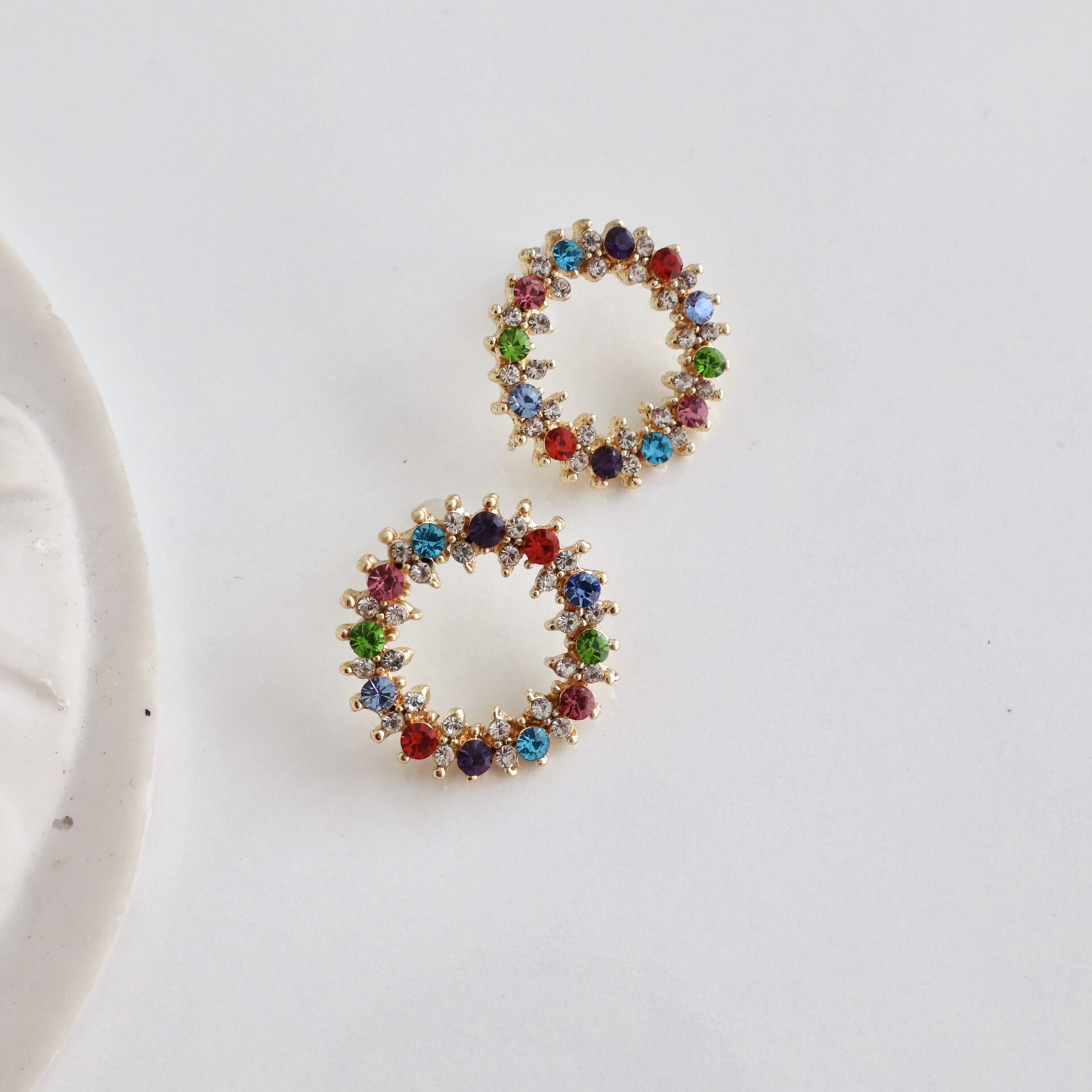 Zirkon ve kristal taşlı pirinç malzeme kaplama bijuteri küpe.